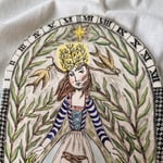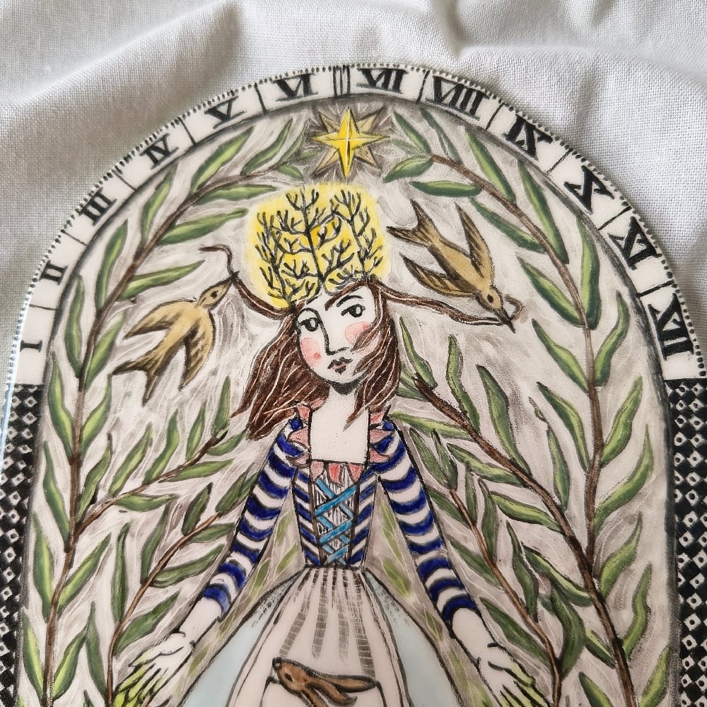 Silvia is a spirit of the forest, she stands amongst the foliage, plants grow out of her green fingers and roots grow from her feet, on the shelf of the plaque. She has a crown of glowing twigs and birds weave her hair. She has a hare in her apron pocket and her skirts are decorated with cherries. The curved top of the plaque has Roman numerals representing the months of the year.